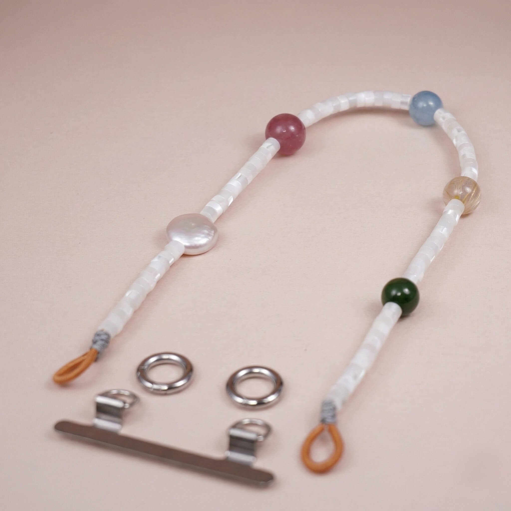 Transform Your Tech with Natural Energy: Handcrafted with shimmering White Mother-of-Pearl and five distinct natural stones. This isn't just a phone strap, it's a wearable energy balancer.