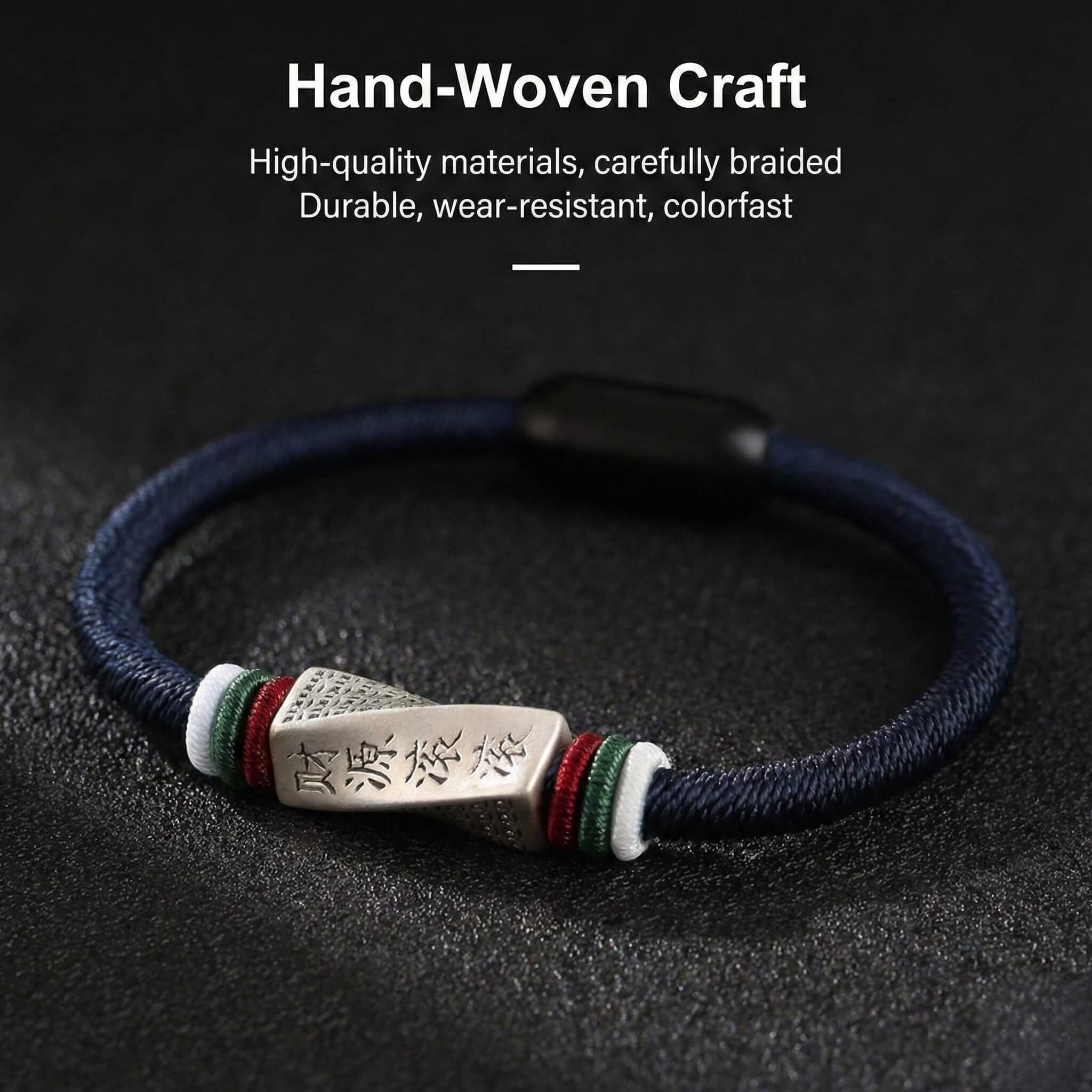 Artisan Braided Rope: Tight, high-density weaving available in Deep Navy or Classic Black. It is skin-friendly, sweat-proof, and designed to fit wrist sizes from 15cm to 19cm (5.9" - 7.5") comfortably.