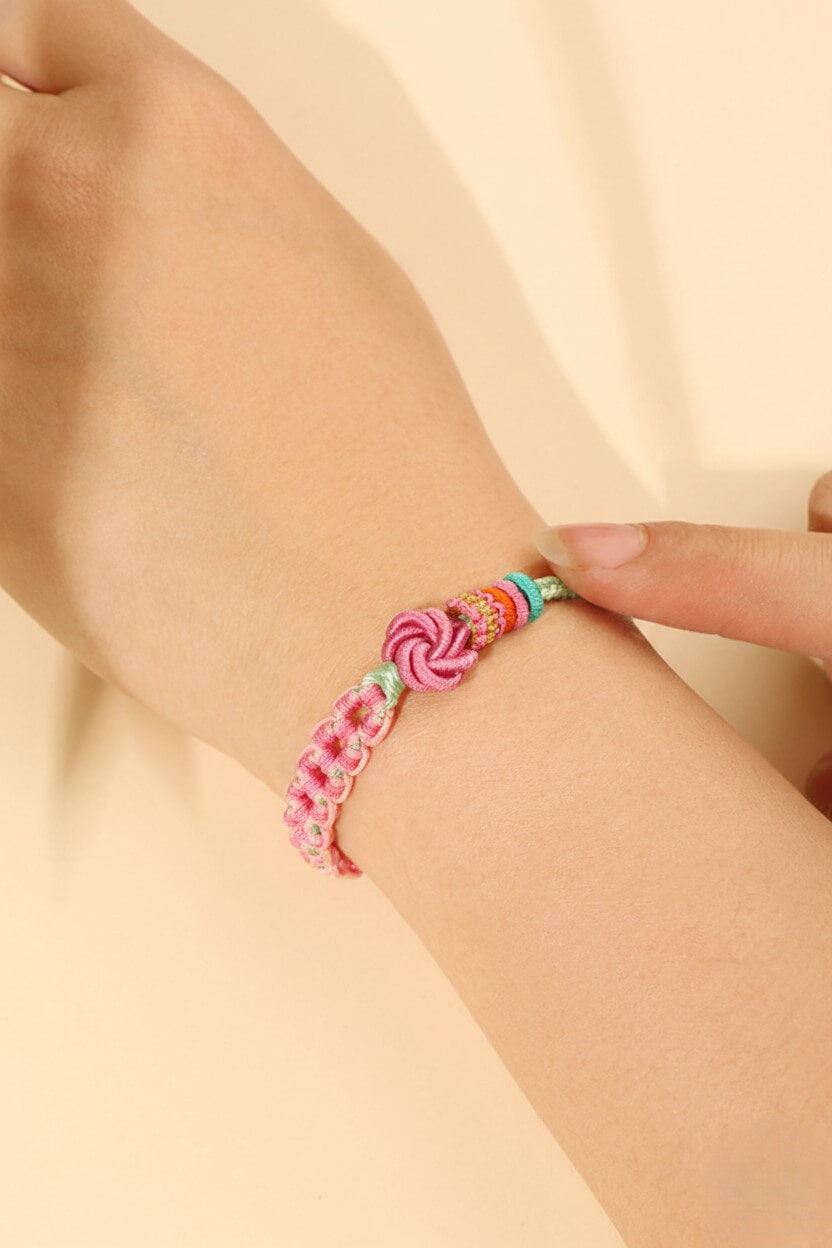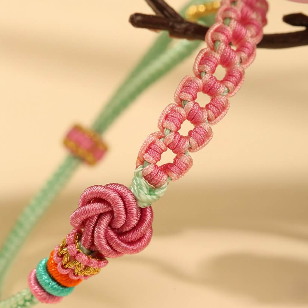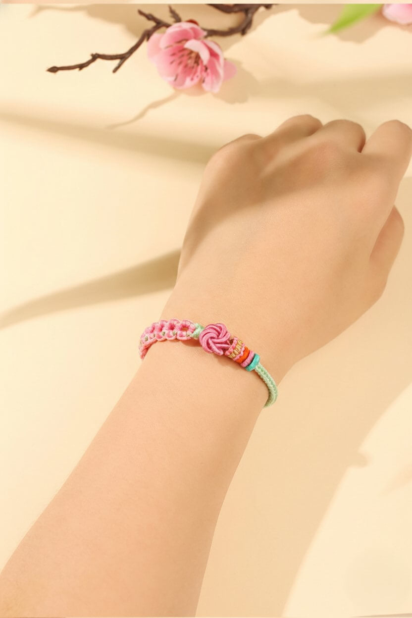 Inspired by the ancient Eastern legend of 'Peach Blossom Luck'. The central Pink Flower Knot represents a heart in full bloom, attracting affection and sweet connections, while the Mint Green band symbolizes the fresh energy of a new relationship. Hand-woven with intention, it serves as a daily reminder: You are ready to be loved."